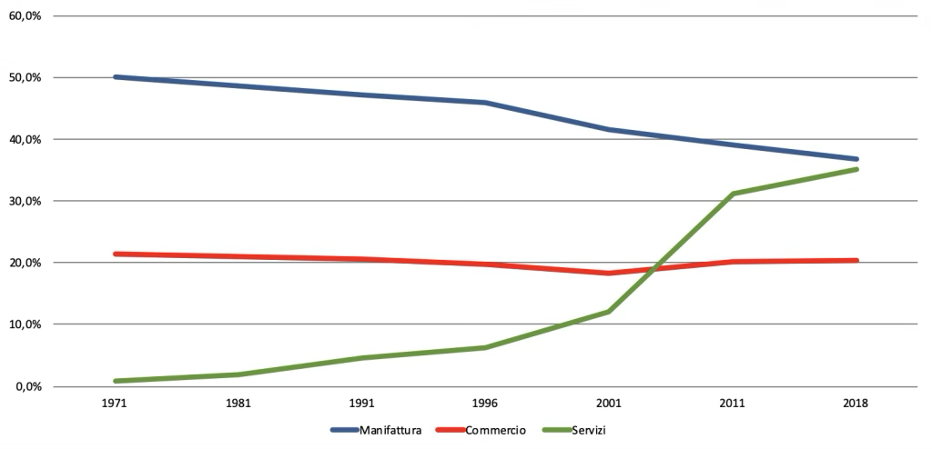 Grafico 1 – Quota di occupazione nei tre settori dell’economia veneta: industria, commercio e servizi (composizione %)