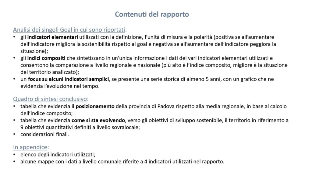 Pubblichiamo le slide utilizzate nel corso della presentazione del primo Rapporto di posizionamento del territorio della provincia di Padova rispetto agli obiettivi di sviluppo sostenibile dell’Agenda 2030 finanziato dalla Camera di Commercio di Padova e curato da AsVeSS.