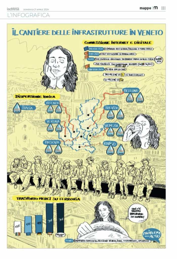 A fare il punto è però, come sempre, l’infografica di pagina 3 che riesce a trasferire in immagini la situazione della nostra Regione: infrastruttura digitale ma anche trasporto merci su ferrovia e per finire l’acqua, dispersione idrica e necessità di nuovi investimenti.